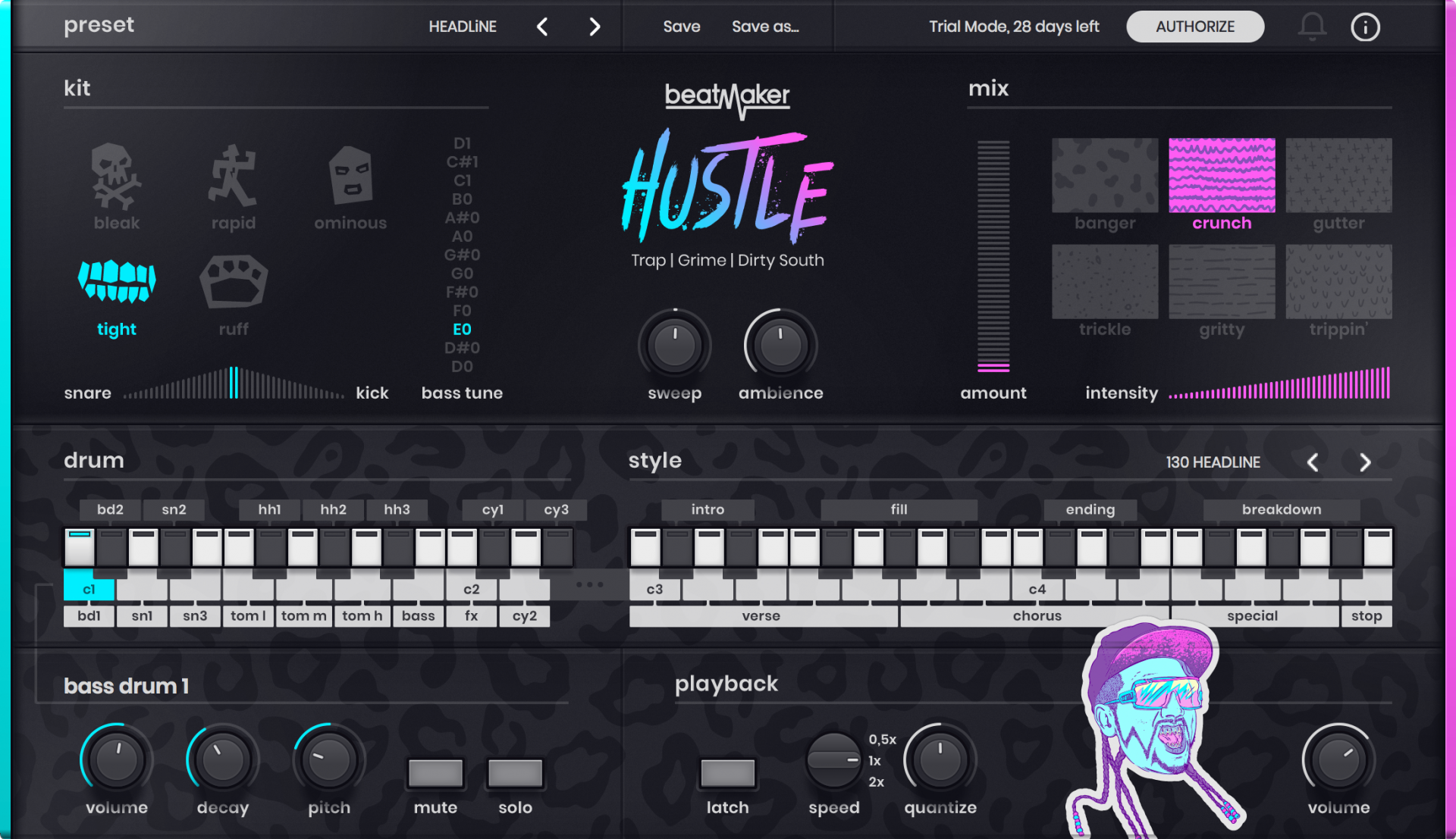 Fai suonare subito la tua produzione come I famosi produttori di Atlanta – casse booming, Hi-hat e rullanti. HUSTLE cattura lo spirito del genere – suoni, pattern e mix. Utilizza una combinazione virtualmente illimitata di beats credibili ispirati alla leggendaria Roland TR-808. I preset di mix offrono una grande varietà di carattertiche sonore che possono essere usate a piacere e adattare HUSTLE al tuo mix, con un suono autentico e “fat”.