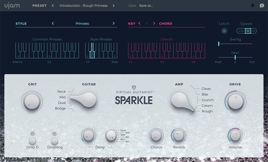 Virtual Guitarist SPARKLE è il tuo specialista per riff di accordi, ottave e singole note: 60s grit, 70s disco, 80s glam, 90s Brit pop, 00s indie e pop elettronico contemporaneo – SPARKLE ha quello che serve!