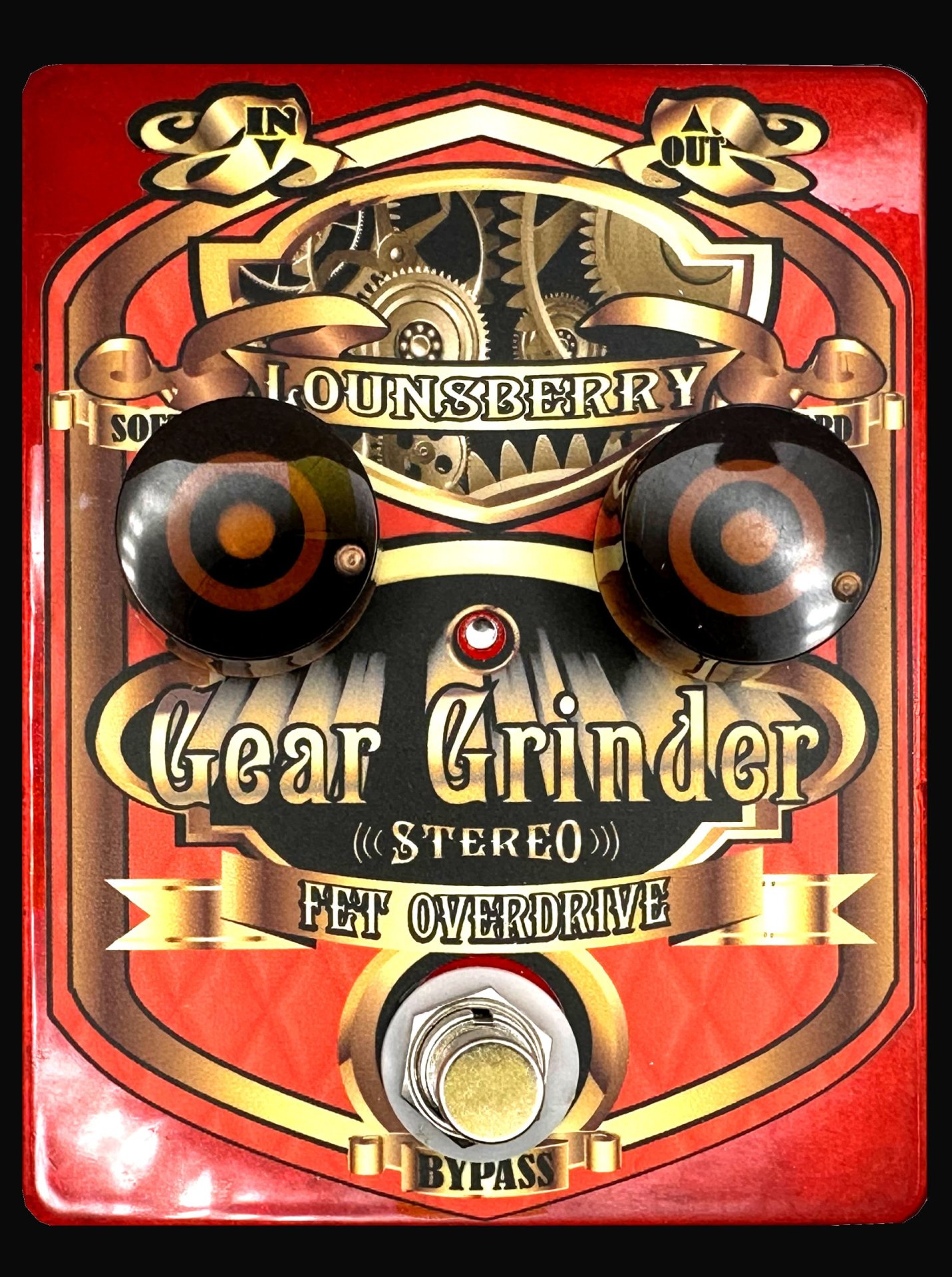 Il Gear Grinder è la versione stereo del famoso ‘’Organ Grinder’’. L'Organ Grinder è stato il primo pedale Lounsberry progettato per le tastiere, progettato con il supporto di Roger Powell degli Utopia. E’ un pedale preamp/overdrive multistadio FET con diodi al germanio, true bypass, perfetto per organi clonewheels, Rodhes, Wurly e pianoforti digitali. E’ un pedale che fornisce un suono caldo e un overdrive dalla pasta sonora valvolare, perfetto per gli amanti dei suoni alla Greg Rollie, Jon Lord, Uriah Heep e suoni tipici dei gruppi della ‘’scena di Canterbury’’. L’attacco dell’overdrive è graduale, facilmente controllabile e aggiunge compressione e armoniche di secondo ordine. La trasparenza e la definizione che lo caratterizzano consentono di suonare anche accordi complessi senza mai impastare il suono. E’ un pedale che suona come se fosse un amplificatore e ricorda l’overdrive della sezione valvolare dei cabinet Leslie. Chassis realizzato dall’artista Mark Hershberger