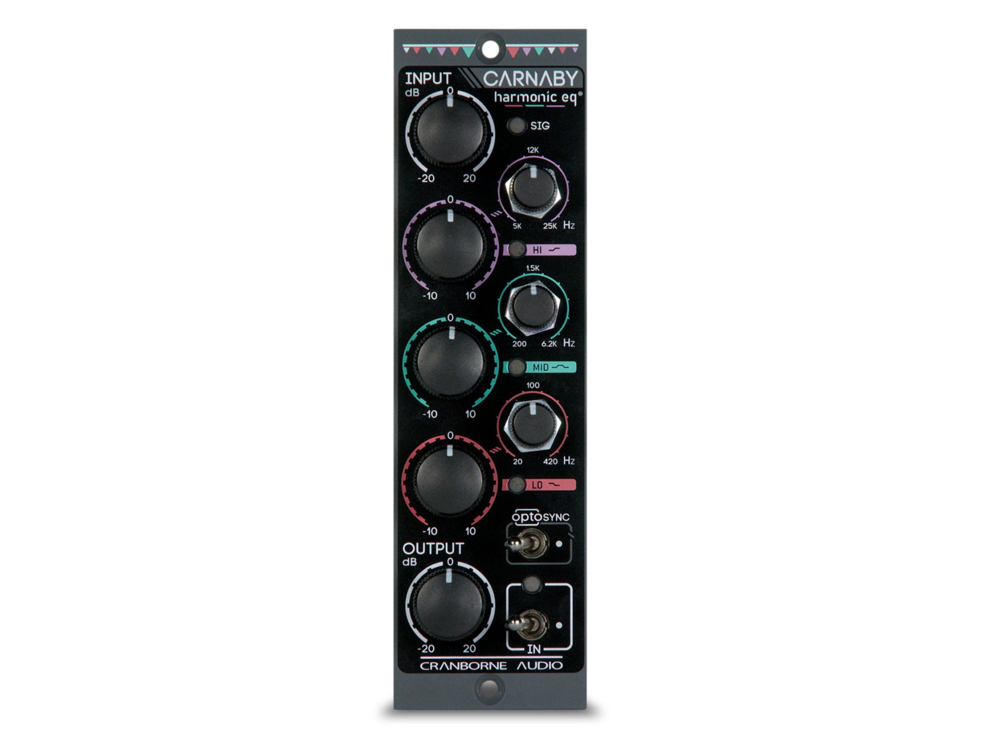 Carnaby 500 è dotato di 3 bande interattive Harmonic EQ™, con ciascuna banda dotata di 10 dB di boost/cut e di controlli di frequenza sovrapposti e regolabili. Ogni banda del Carnaby 500 ha una miscela unica di contenuto armonico adatta alla sua banda di frequenze, così da poter ottenere la massima musicalità. La banda HI copre la gamma che va da 5kHz a 25kHz e utilizza una saturazione omogenea per estendere in modo naturale le alte frequenze oltre la banda audio, per dare aria e respiro alle voci e agli strumenti acustici. La banda LO agisce sulla gamma da 20Hz a 420Hz ed utilizza una saturazione di tipo hard-clipping per estendere le frequenze subarmoniche nella gamma bassa udibile: perfetta per un sottile boost della gamma bassa o per una saturazione subarmonica estrema. La banda MID è un filtro peak con un Q fisso ed un'ampia gamma di frequenze regolabili da 200 Hz a 6,2 kHz. Utilizza la saturazione per aggiungere enfasi armonica alla sorgente in qualsiasi punto della gamma di frequenze. A differenza di altri EQ, Carnaby 500 ha una risposta molto dinamica ed aumenta il boost/cut totale e le armoniche man mano che i circuiti vengono saturati. Un controllo del livello di ingresso e di uscita su ciascuna banda consente di regolare il livello di ±20dB, permettendo di pilotare Carnaby 500 con maggiore intensità con il controllo di ingresso per ottenere effetti di saturazione e distorsione, o di ridurlo per ottenere un'equalizzazione più pulita quando necessario.