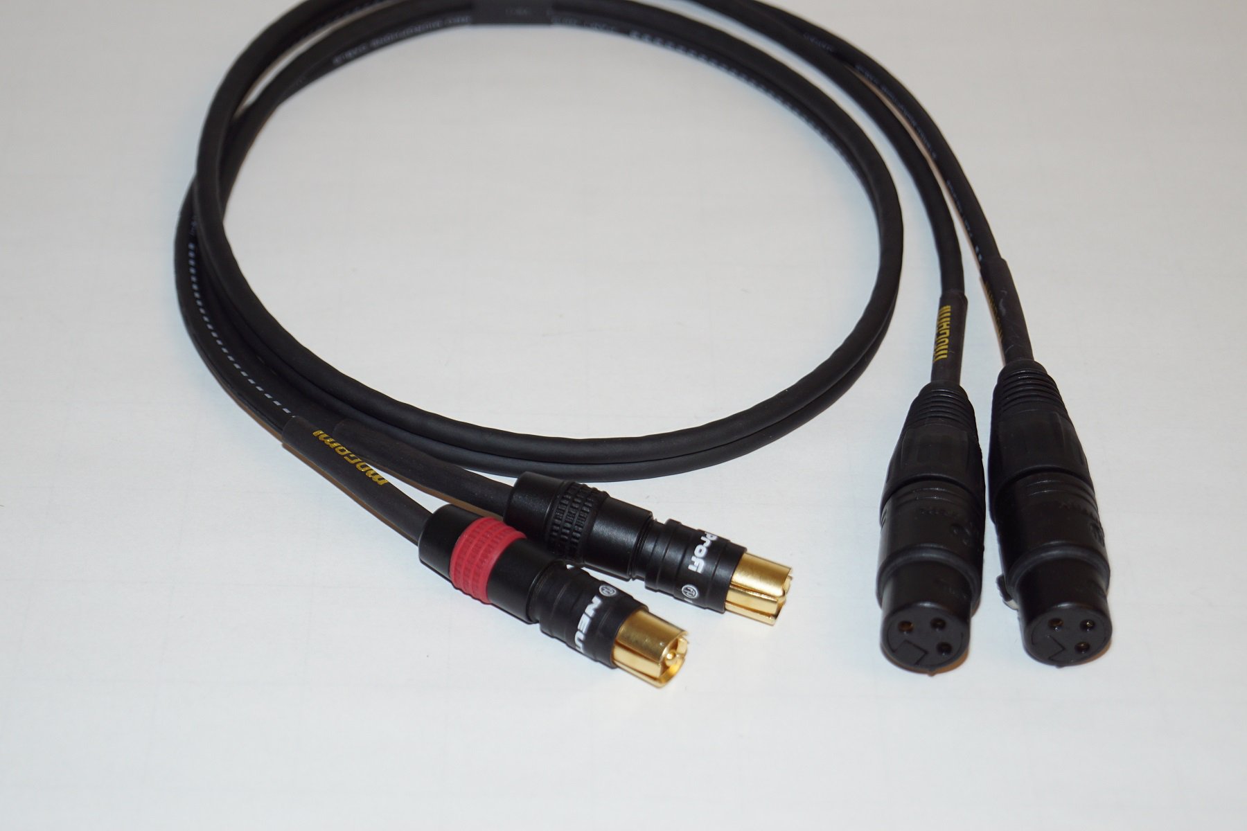 2 x Neutrik NF2C-B/2 Cinch <> 2 x Neutrik NC3FXX-B XLR Femmina, rivestimento nero cromato, contatti placcati in oro. Cavo Mogami 3106 nero, bilanciato.