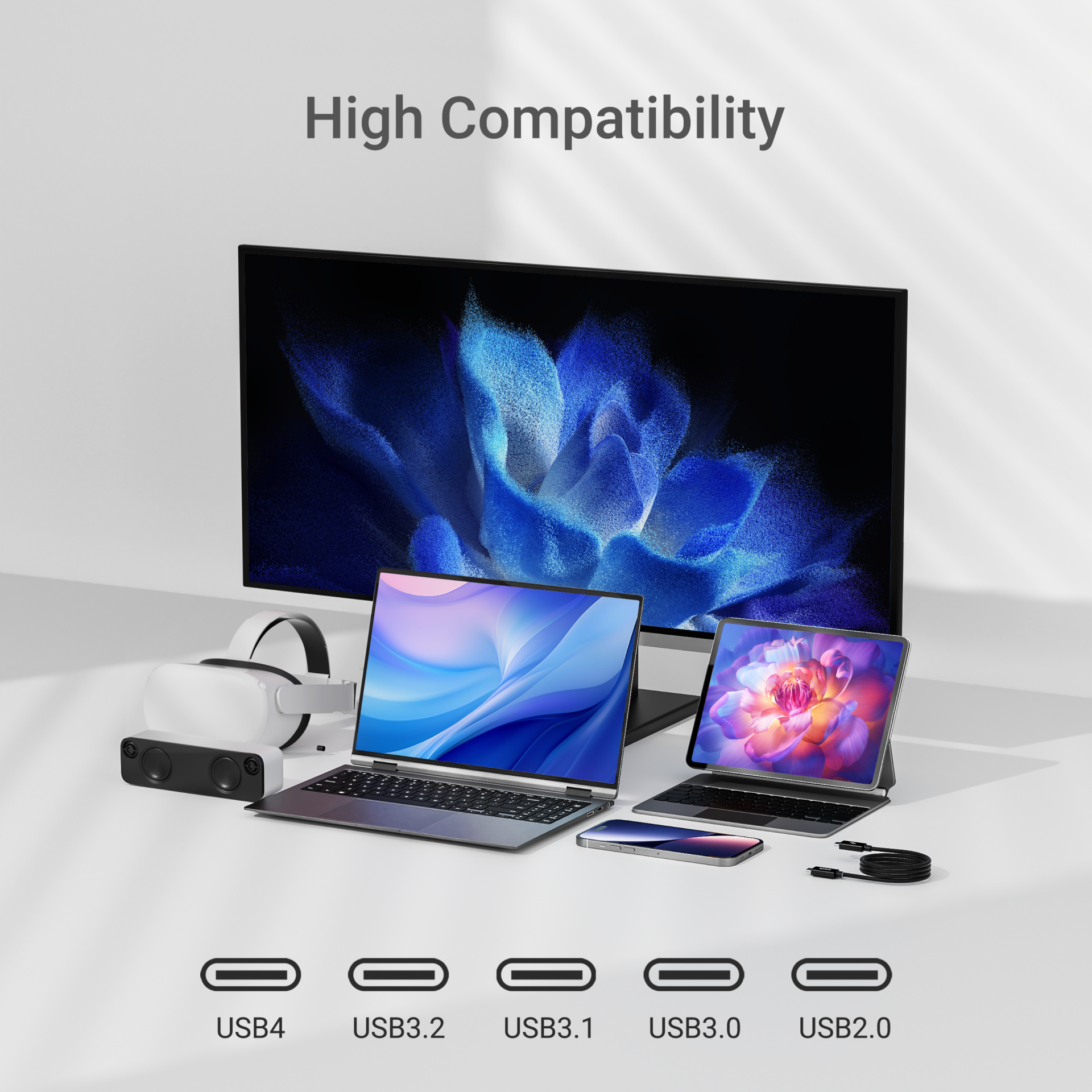 Supporta la trasmissione ad alta velocità a 40 Gbps, la doppia visualizzazione estesa 4K@60Hz e 8K@30Hz. Compatibile anche con schermo singolo a 6K@60Hz e doppio display speculare a 4K@60Hz. Trasferimento dati bidirezionale, erogazione di potenza fino a 100 W e funzionalità di collegamento a caldo.