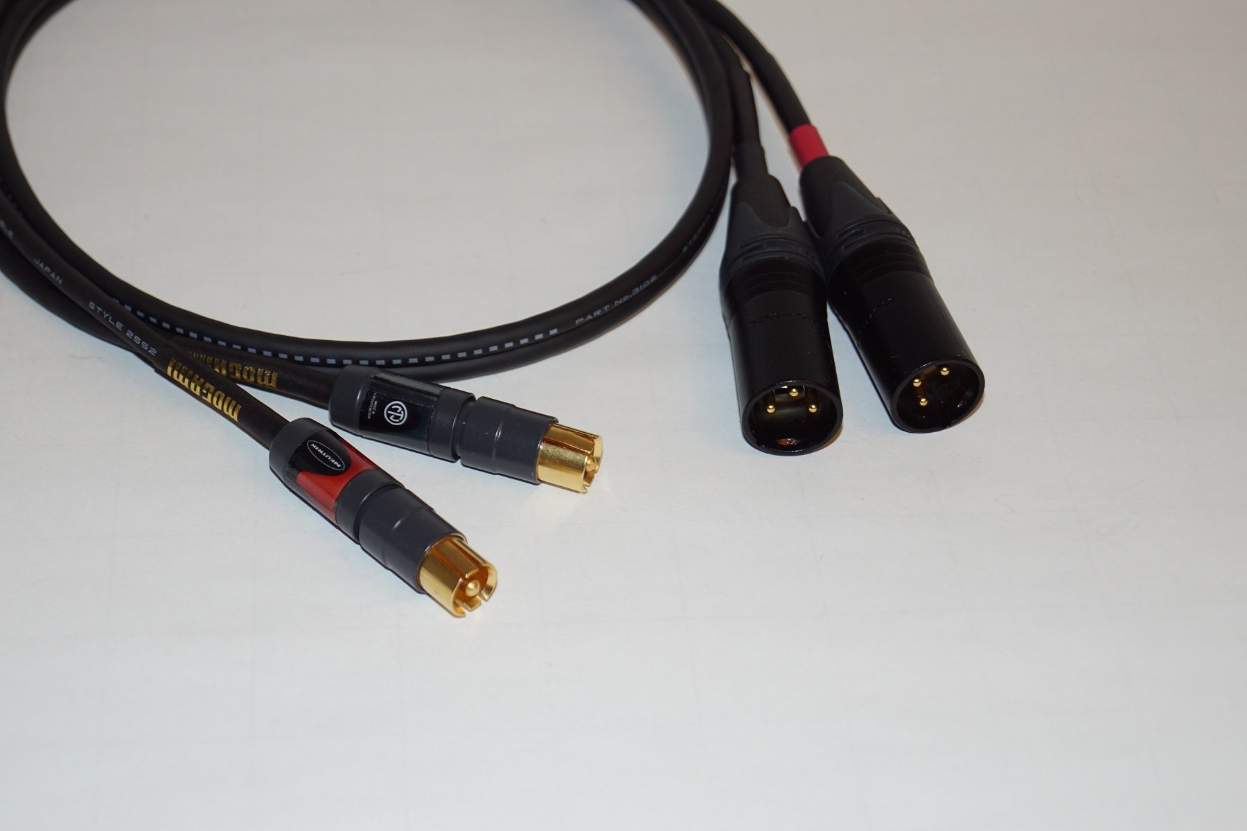 2 x Neutrik NF2C-B/2 Cinch <> 2 x Neutrik NC3FXX-B XLR Maschio, rivestimento nero cromato, contatti placcati in oro. Cavo Mogami 3106 nero, bilanciato.