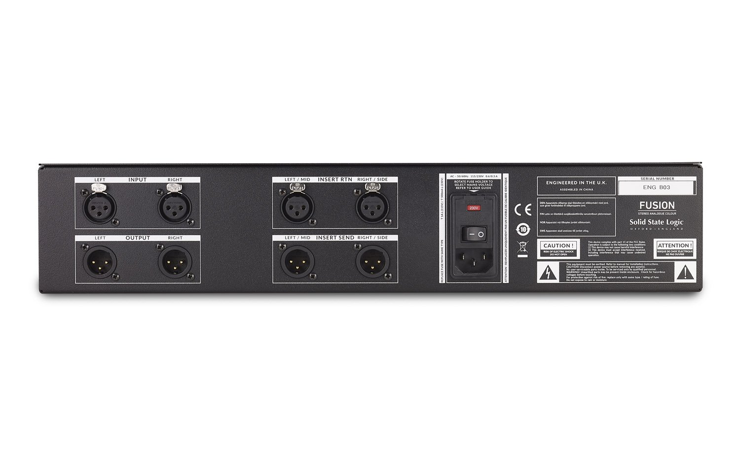 Basata su un progetto concepito appositamente per lo studio ibrido moderno - SSL è da sempre concentrata sull'implementazione di caratteristiche in grado di snellire e accelerare il flusso di lavoro della produzione - la Fusion non fa eccezione, sposando questa logica con una gamma di caratteristiche che aiutano ad ottimizzare il workflow. Ad esempio: controllo trim di +/-12 dB in Input e Output; led per l’overload in input; meter “peak hold”; filtro passa alto frontale; indicatore dello stato tricolore per le sezioni Vintage Drive e HF Comp. Le connessioni XLR possono essere usate sia come insert stereo sia per processare il missato o “switchati” alla funzione Mid-Side (MS) permettendo a compressori o EQ separati di essere applicati al middle (centro) e ai lati di un segnale stereo. In modalità stereo insert, il punto di insert può essere impostato o pre-Violet EQ o, in modalità MS, pre-Stereo Image control. Le connessioni in ingresso e in uscita sono in formato XLR.