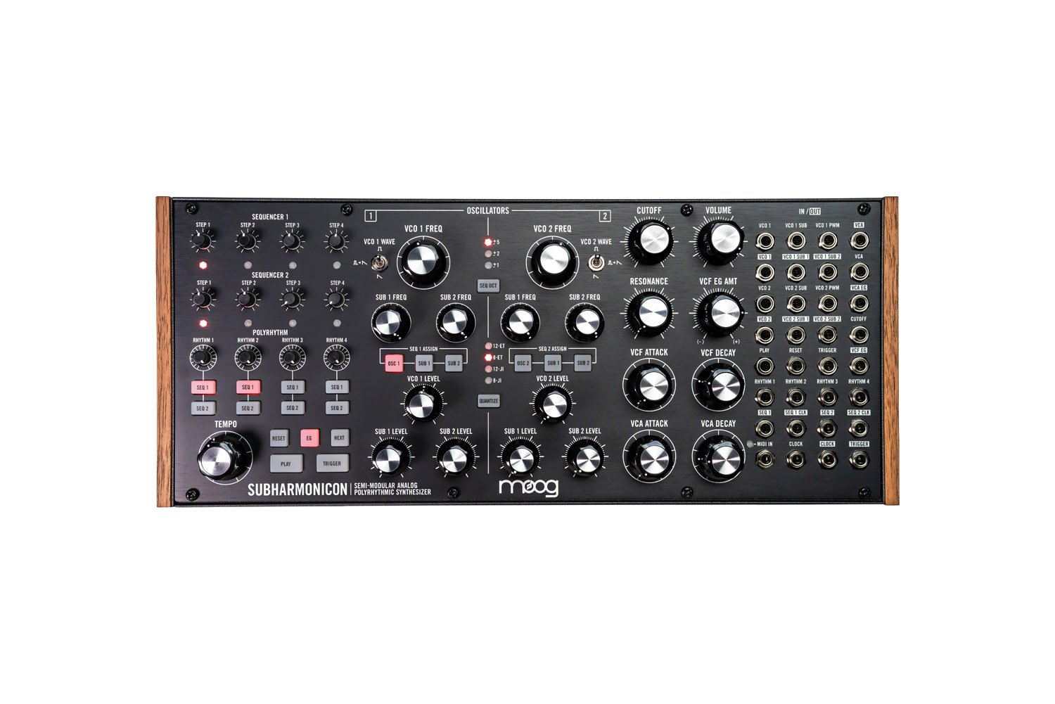 Subharmonicon è un sintetizzatore semi-modulare realizzato in modo artigianale nella fabbrica americana Moog in grado di generare suoni e pattern complessi pur essendo estremamente semplice da utilizzare. Con due VCO, quattro Subharmonic Oscillator, due 4-Step Sequencer e quattro Rhythm Generators, le possibilità di creazione dei suoni sono garantite, sia in modalità standalone che in combinazione con gli altri membri della famiglia di semi-modulari Moog Mother-32, DFAM, o con qualsiasi altro hardware esterno compatibile Eurorack.