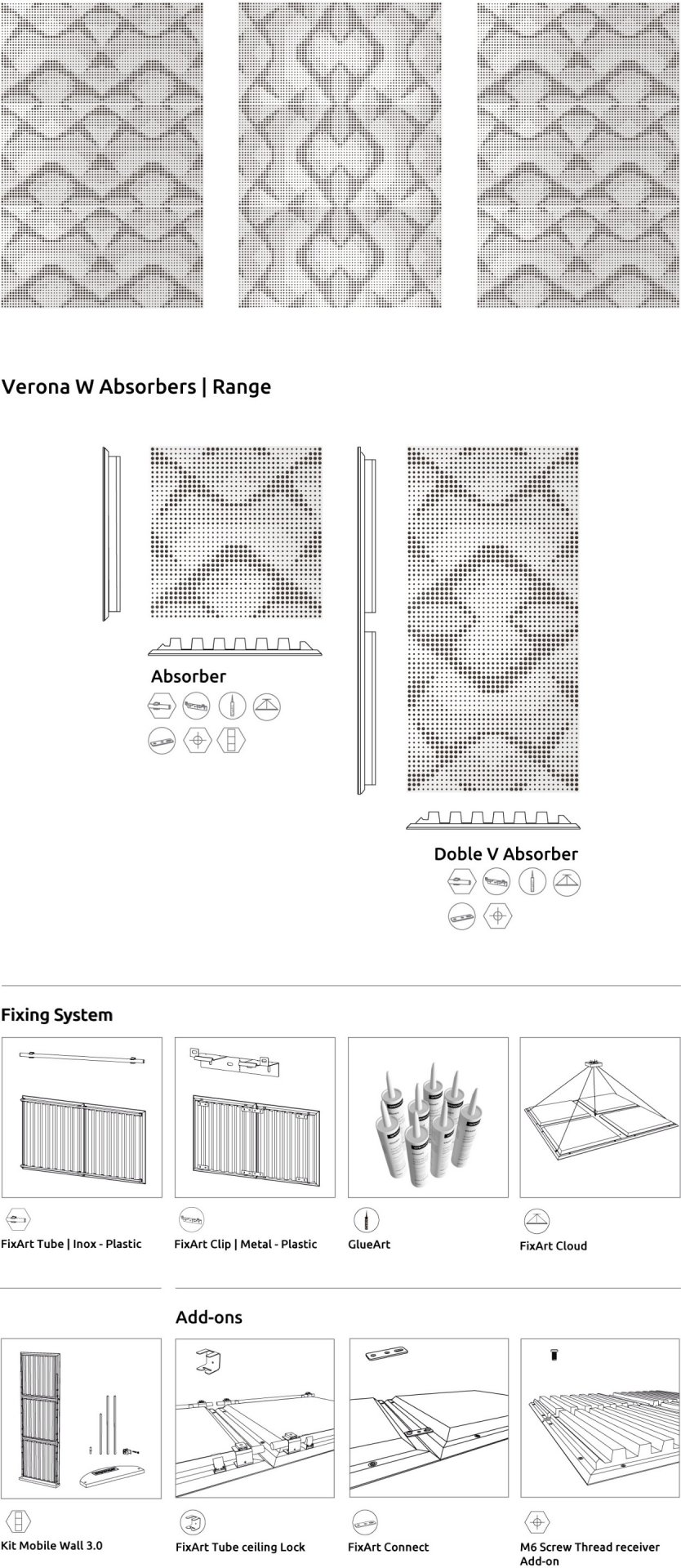 Lo scopo principale del pannello Verone è quello di occuparsi dei problemi di assorbimento sulle medie e le alte frequenze, riducendo i problemi delle onde stazionarie e delle loro riflessioni. Il pattern esclusivo Verona offre un effetto 3d sulla sua superficie, permettendo di combinarlo con più stili di design e di creare uno stile unico e distinguibile all'interno della propria stanza.