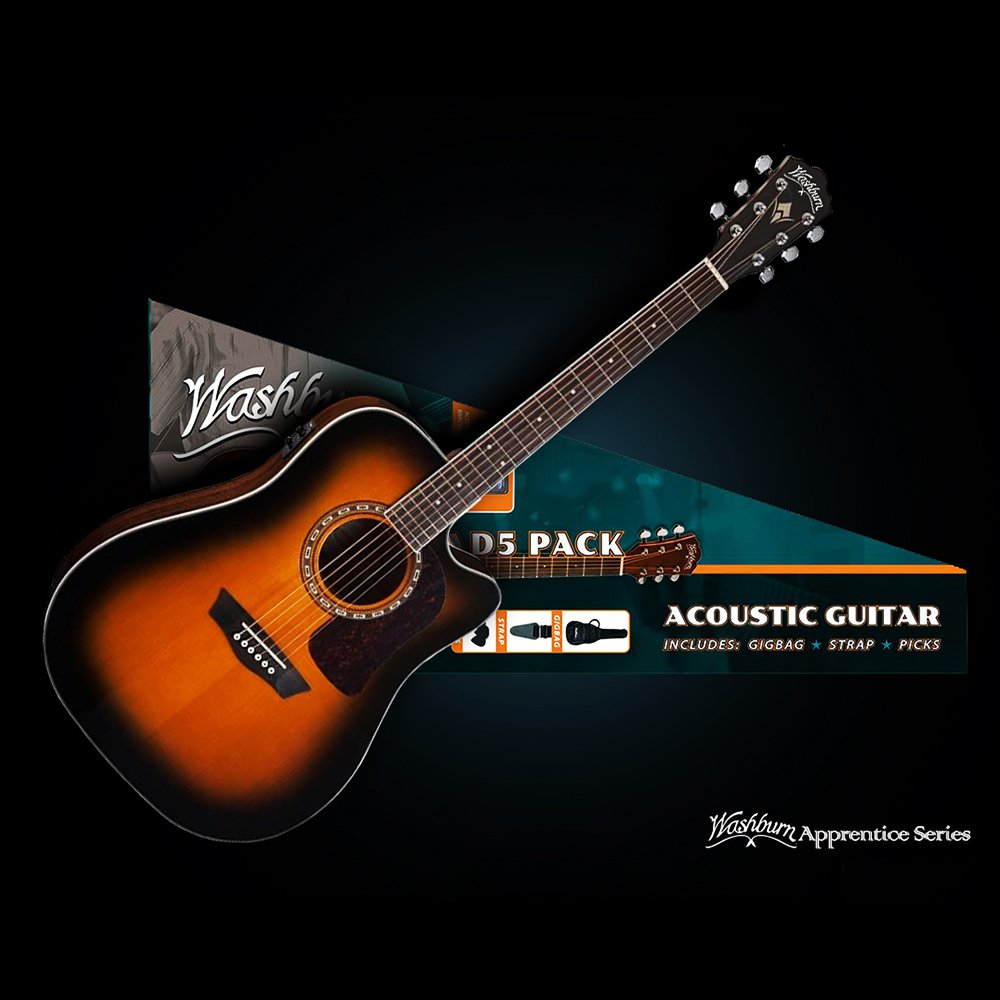 La Washburn AD5CE è una chitarra acustica dreadnought elettrificata a spalla mancante con top in abete selezionato, fondo / fasce in mogano e binding nero. La confezione include una borsa morbida, una tracolla e alcuni plettri.