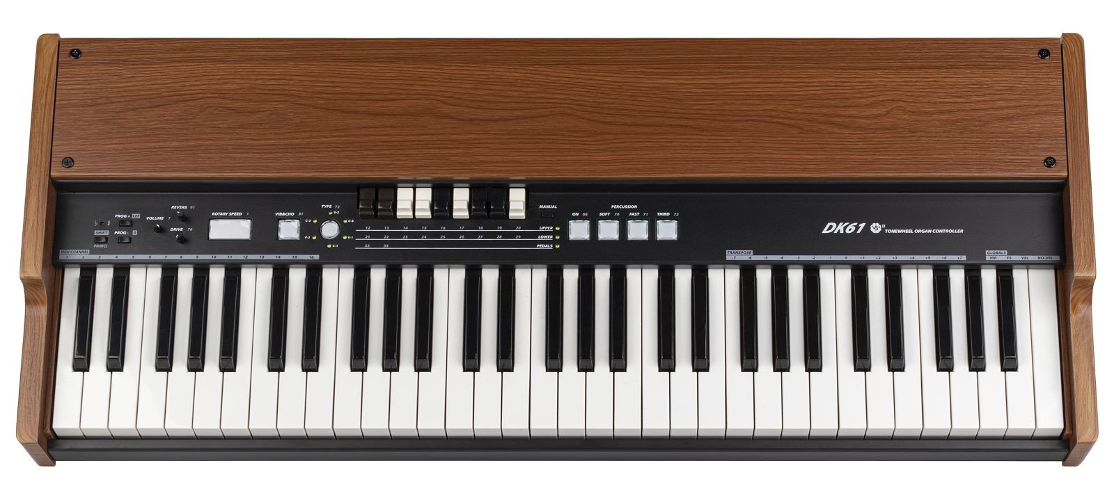 DK61 ha un design molto tradizionale con fianchi e top in legno. Finalmente i possessori di software e moduli sonori che replicano il suono del tonewheel organ hanno la possibilità di gestirli tramite un controller nato per questo scopo, con tutte le caratteristiche hardware necessarie a questo peculiare strumento ad un costo estreamamente contenuto.