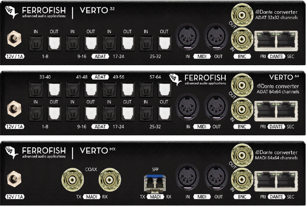 Sul lato Dante sono presenti due prese RJ45, anch'esse preparate per un funzionamento ridondante. Verto MX supporta un sample rate fino a 192kHz e offre connettori MIDI per gli aggiornamenti e connettori BNC wordclock per la sincronizzazione esterna.