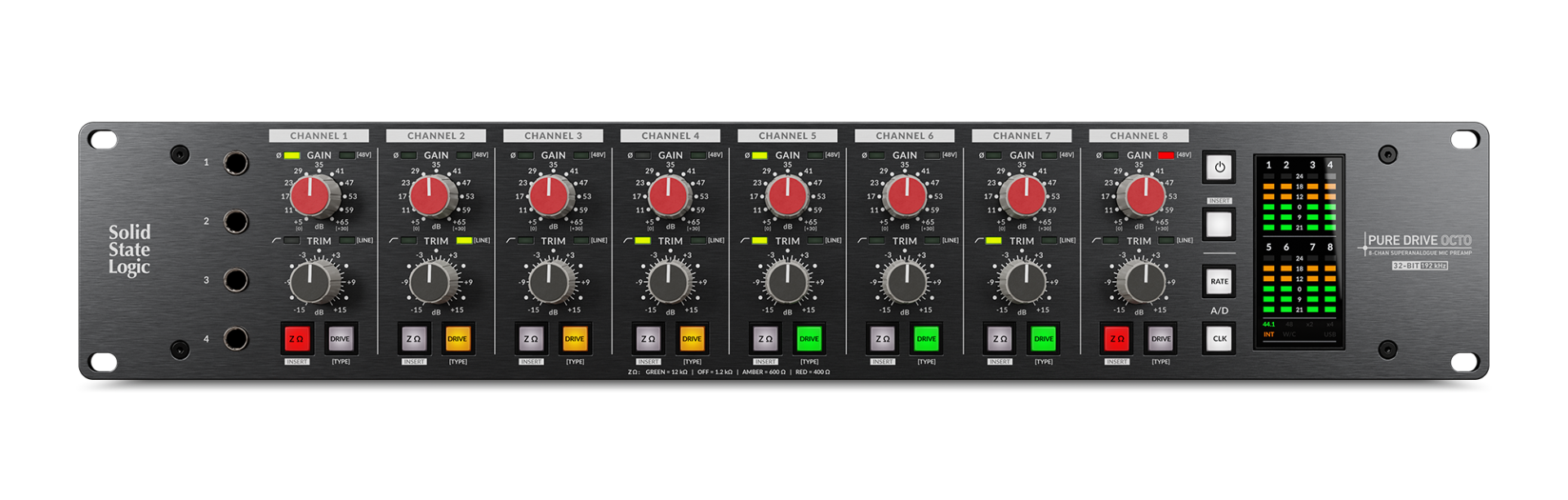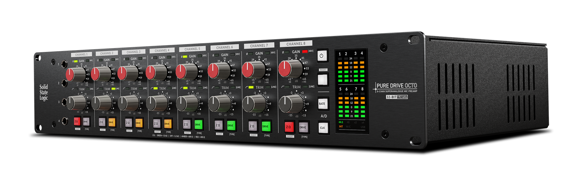 PURE DRIVE OCTO sfrutta la rinomata tecnologia del preamplificatore microfonico SuperAnalogue PureDrive™, già presente nella console ORIGIN di Solid State Logic, introduce una nuova modalità DRIVE e una nuova connettività, e la rende disponibile in un'unità rackmount 2U a 4 canali.