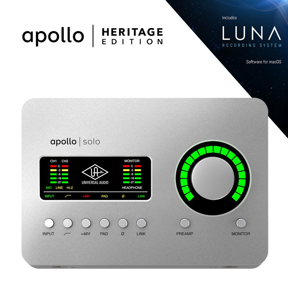 Caratterizzata dalla conversione di ottima qualità Universal Audio, due preamplificatori microfonici Unison e una suite di effetti integrati, Apollo Solo Heritage Edition porta una qualità da studio di registrazione direttamente sulla tua scrivania. Questa interfaccia audio 2x4 Thunderbolt 3 per Mac e Windows è alimentata via bus e include una ricca raccolta di plugin UAD per registrare voci e strumenti con una latenza che rasenta lo zero. Inoltre, permette l’integrazione totale con il nuovo sistema di registrazione Universal Audio LUNA Recording System.