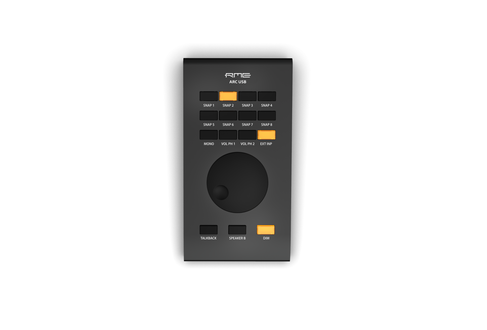 Il Remote Control viene collegato all’interfaccia audio attraverso un cavo da 5m e un connettore speciale sul pannello posteriore delle schede.Sul pannello superiore dell’ARC si trova un encoder rotativo con funzione di pulsante, 2 pulsanti inferiori e 6 pulsanti superiori con LED di stato.