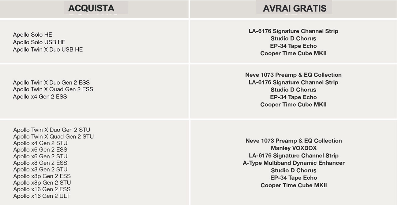 Questa importante promo Universal Audio consente fino al 30 Aprile 2026 di avere in omaggio un ricco bundle di plug-in (fino a nove) a fronte dell'acquisto di alcune inferfacce Apollo Desktop o Rackmount selezionate.