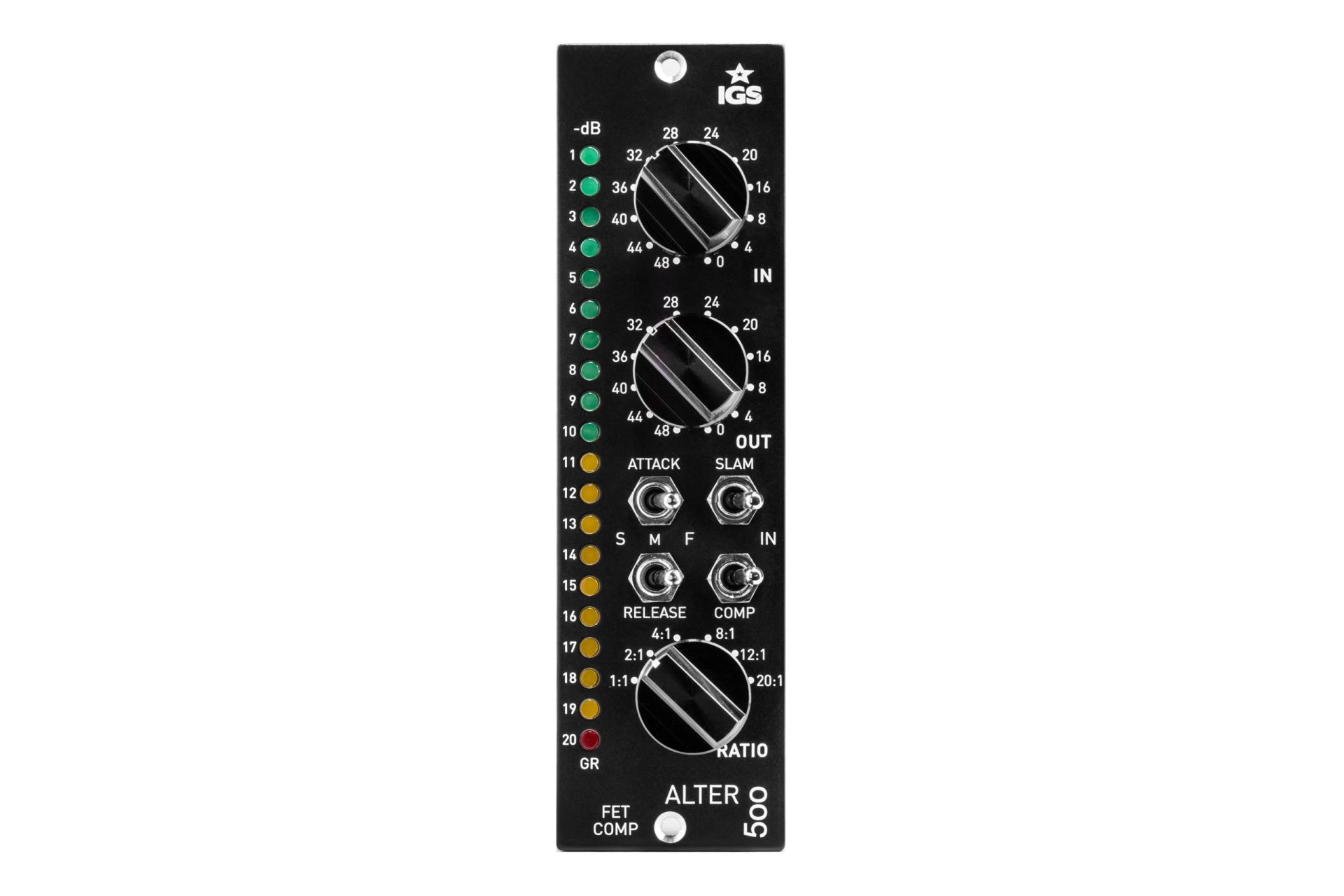 La tipologia FET venne usata negli anni ’70 nel leggendario compressore UREI 1176.ALTER è un’unità a singolo canale con controlli di ingresso ed uscita con potenziometri a scatti, così come il controllo Ratio a sei posizioni, che include però due opzioni (1:1 e 2:1) non presenti sull’originale 1176.